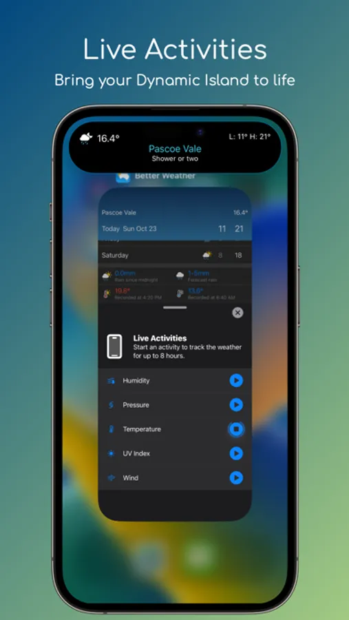 * Live activities – view current conditions in your Dynamic Island or Lock Screen for up to 8 hours