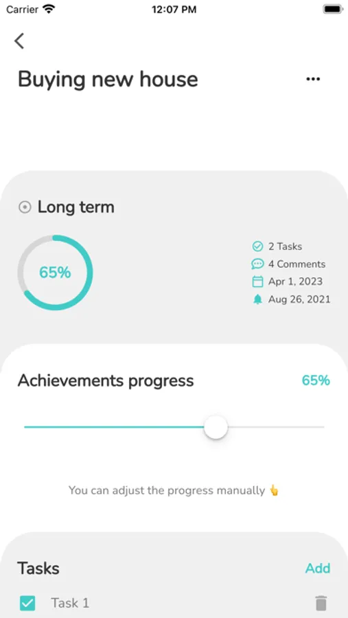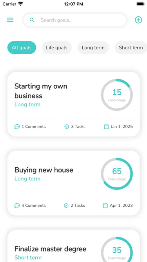 This is the best app of its kind. I love everything about except the manual adjustment for percentage of completion towards goal. The categories for goals, the task list, other information boxes, all so so good. Automate the process of percentage completion via the checked tasks and it’s a 5 star app all the way.