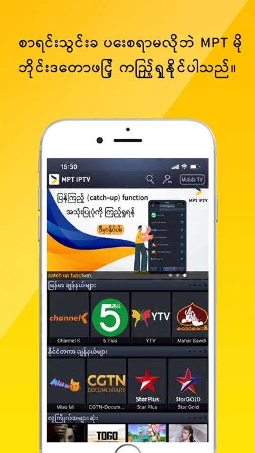 Watch TV on your Mobile Phone with MPT IPTV anytime anywhere without subscription fees.