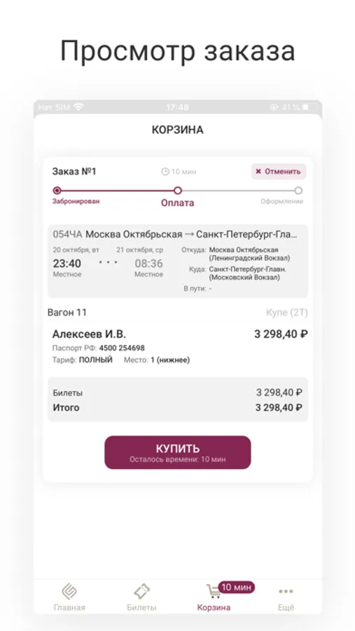Просмотр маршрута поездки. Просмотр приобретенных билетов по прошлым и будущим поездкам.