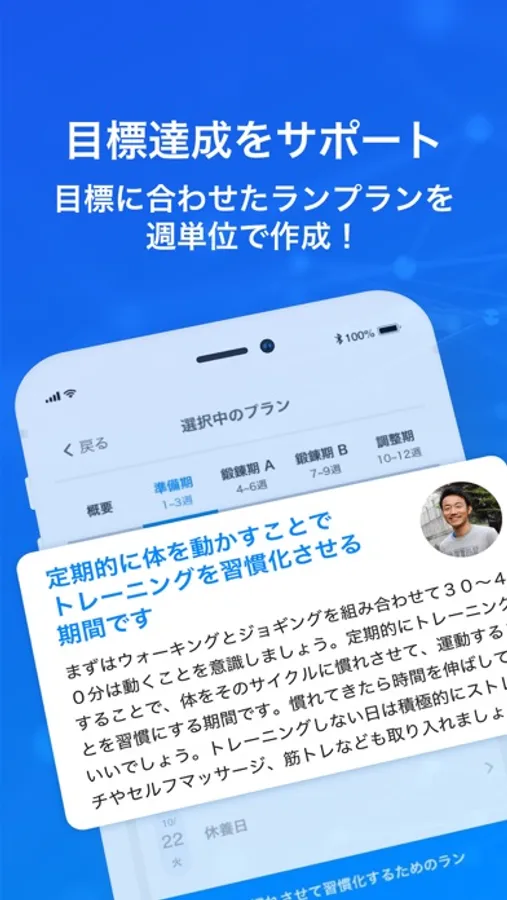 •プロのコーチング:実業団のランナーから運動初心者までを幅広く指導してきた、プロコーチのノウハウを詰め込んだ独自のAIが、あなたを目標達成まで最短距離で導きます。