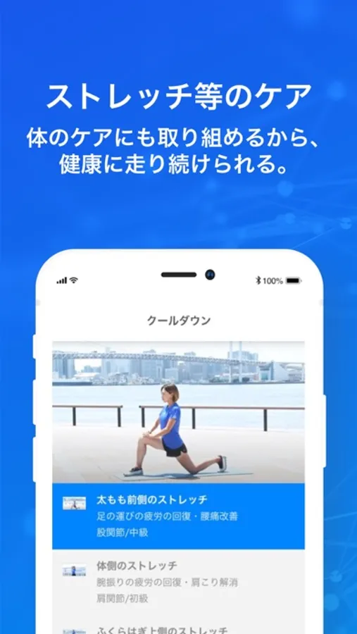 •ランニングに適したストレッチ:ランニングの動きに関わる部位のストレッチを、ウォームアップとクールダウンでそれぞれレコメンド。怪我の予防と快適な走りを実現します。