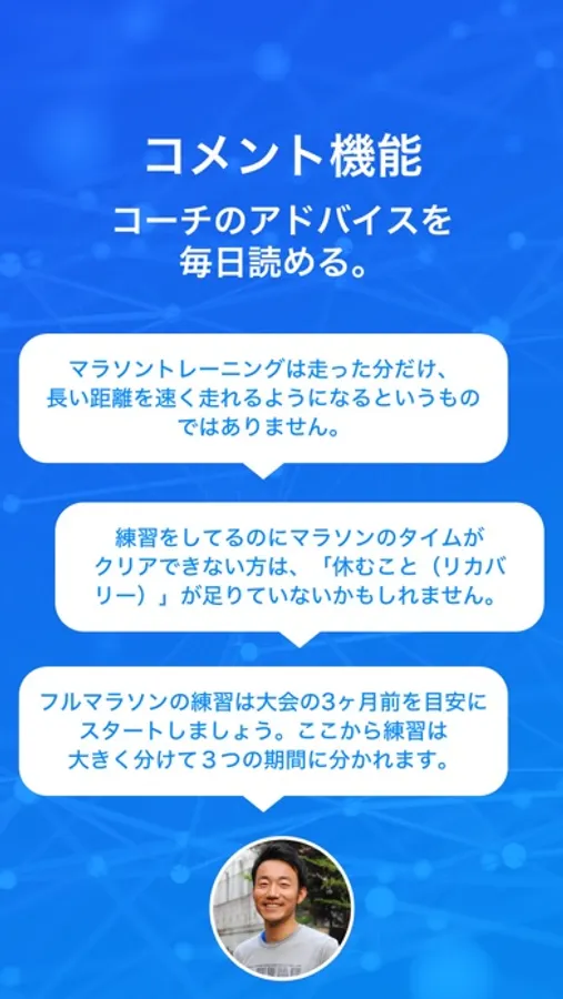 •アドバイスコメント:ランニングにまつわるプロコーチの知識、ノウハウをコメント機能で毎日お届け。ランニングをより楽しむための情報が手に入ります。