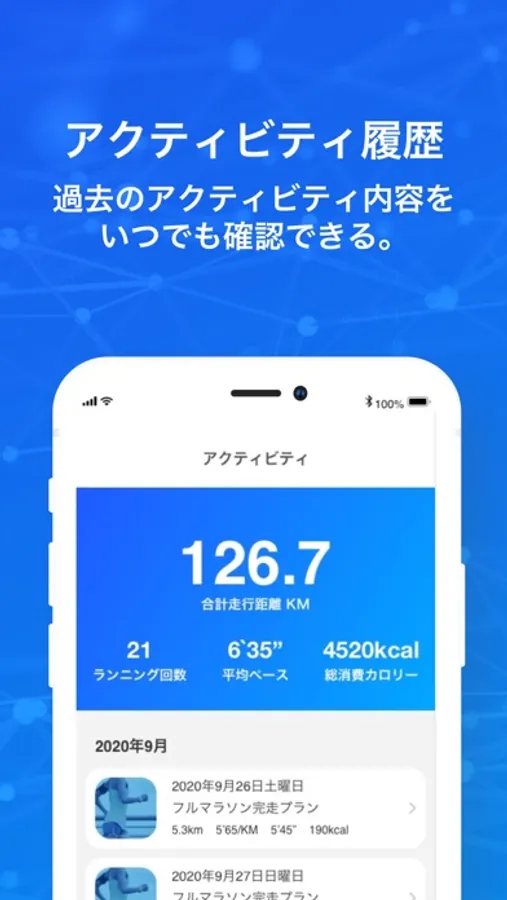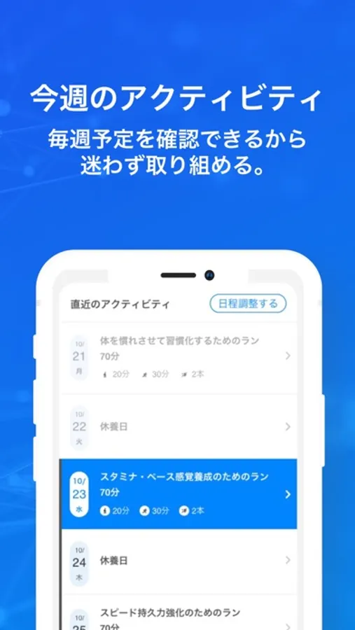 •週単位のスケジュール:ランニング初心者〜上級者まで、それぞれの目標に合わせて、走る距離や頻度を週単位で作成。あなたの生活やライフスタイルに合わせてランニングを行えます。