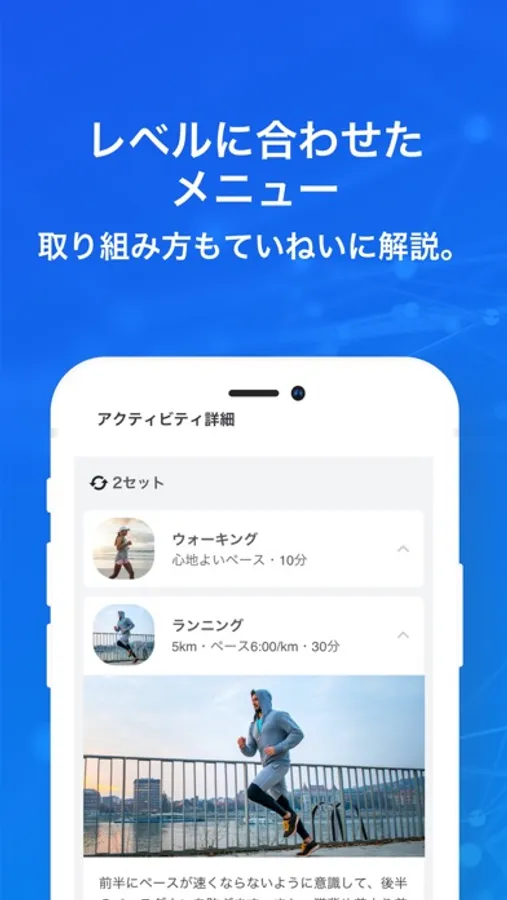 •幅広いレベルに対応:ペース走やインターバル走など、あなたのレベルに合わせて基礎〜専門的なランニングプランまでを作成。自己流のランニングでは得られない体の変化を実感でき、モチベーションを高めます。