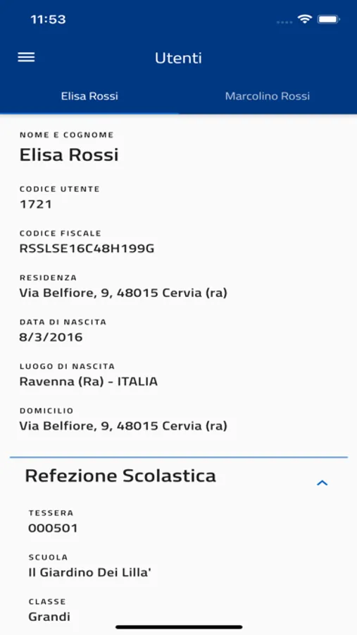 - utenti (seguendo il concetto cardine della suite eCivis Solutions del nucleo famigliare, l'accesso alla app permette di visualizzare tutti gli utenti iscritti ai diversi servizi del nucleo famigliare)