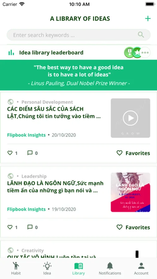 Include creative and big ideas in the world across many different fields. This library can be a source of inspiration for your creativity. And you can also use this feature to share and connect your favorite ideas with others. The famous American psychologist, Adam Grant, once said: "The most meaningful way to succeed is to help others succeed.”