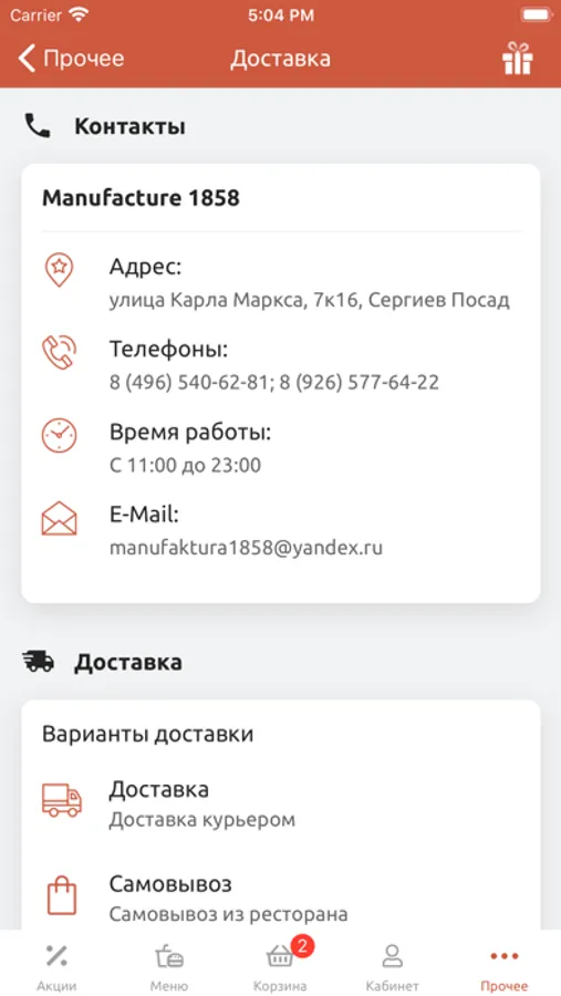 Ресторан «Мануфактура» осуществляет доставку готовых блюд всем тем, кто хочет наслаждаться ими у себя дома. Курьерская служба работает ежедневно без праздничных и выходных дней с 11.00 до 23.00.