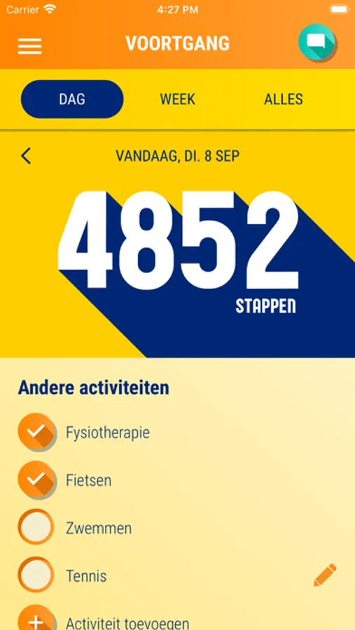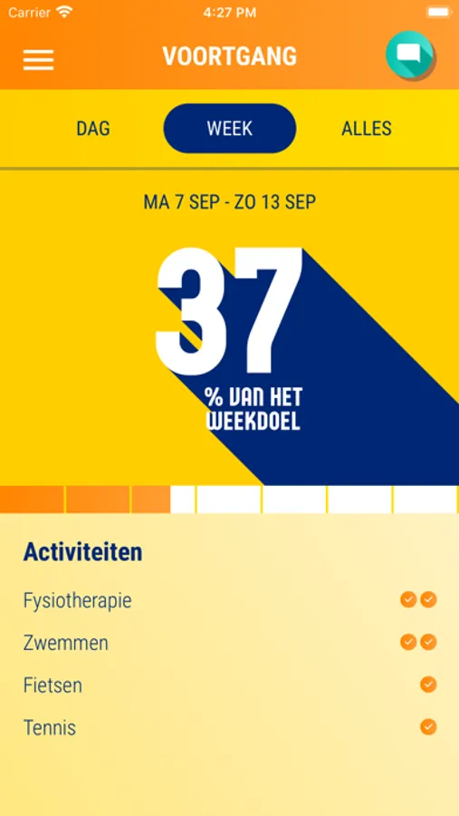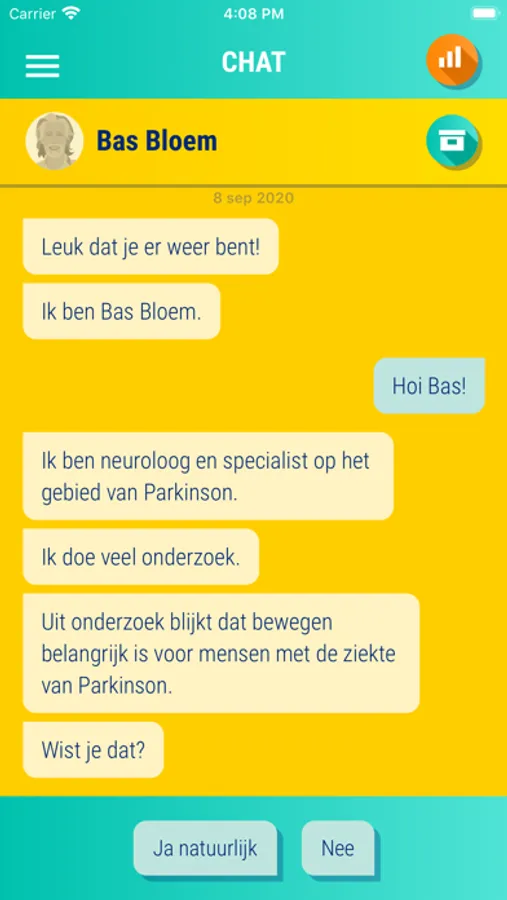 Onderzoek toont aan dat bewegen belangrijk is voor mensen met de ziekte van Parkinson. Deze app stimuleert mensen met de ziekte van Parkinson om meer te bewegen. In de app worden je stappen gemeten en je voortgang op je weekdoel gemonitord. Daarnaast word je gestimuleerd door een virtuele coach.