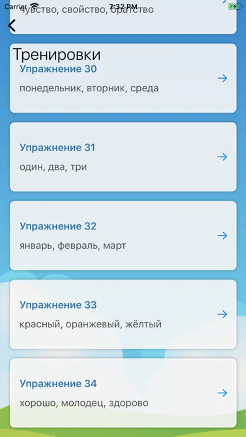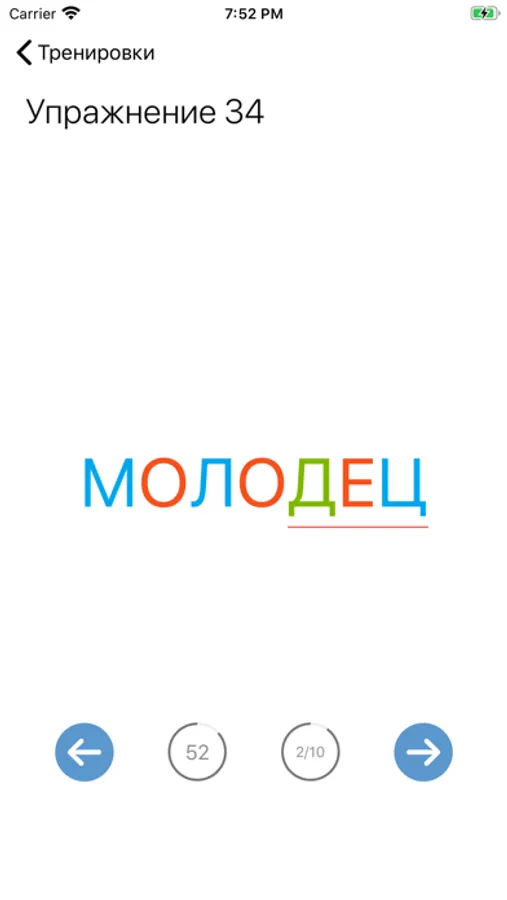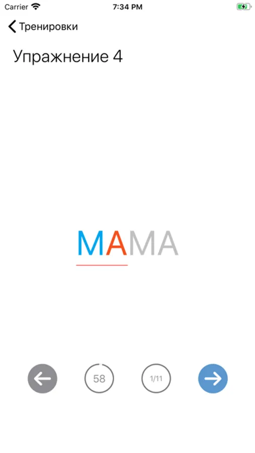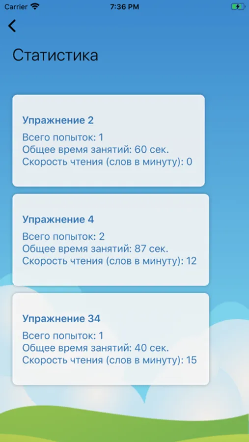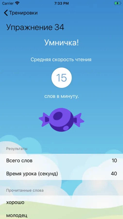 Одна тренировка длится минуту. Урок заканчивается либо по времени, либо когда прочитаны все слова из упражнения.