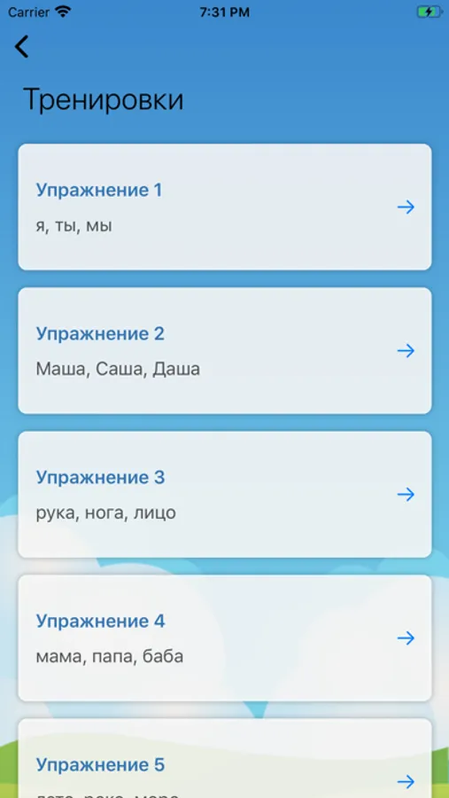 Обучение начинается с простых слов с постепенным увеличением сложности (для отработки трудных буквенных сочетаний). Упражнения содержат самые употребимые слова русского языка, а также словарные слова. Тренажёр также позволяет приблизительно оценить скорость чтения в минуту.