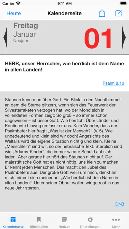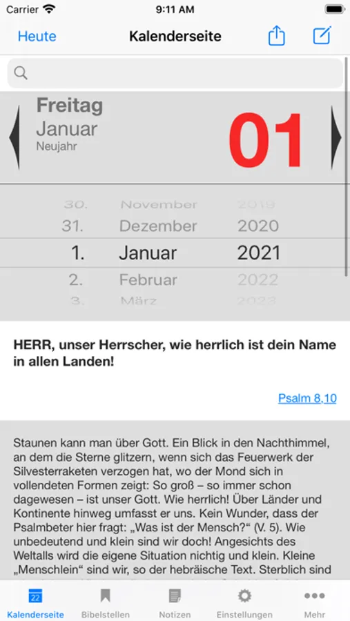 - Heute-Ansicht mit Datum, Wochentag, Bibelvers, Auslegung