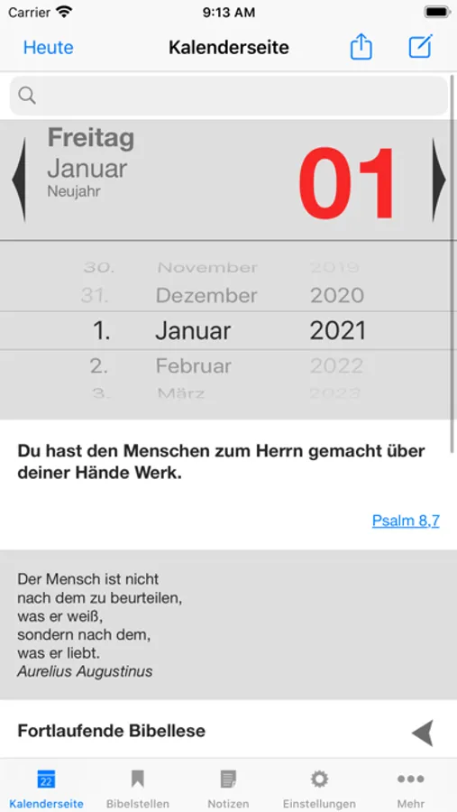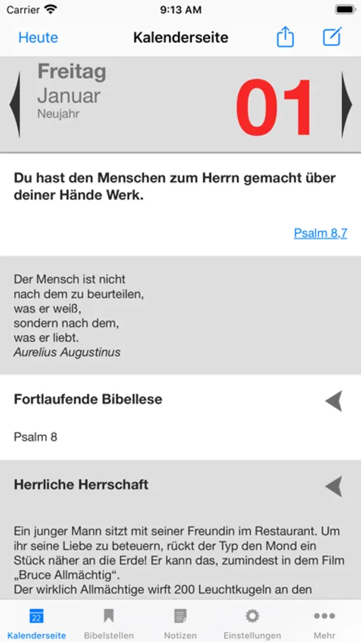 - Heute-Ansicht mit Datum, Wochentag, Bibelvers, Auslegung
