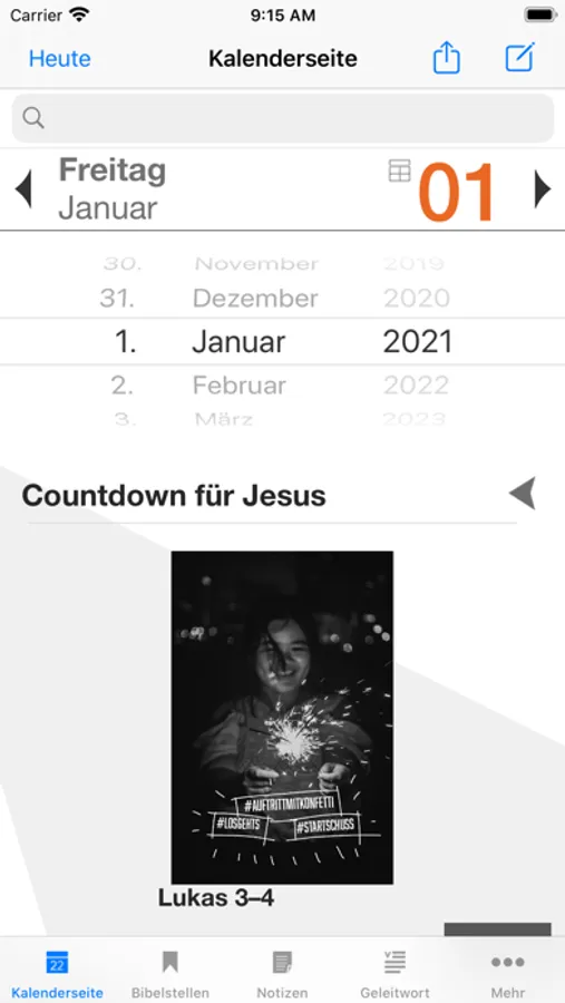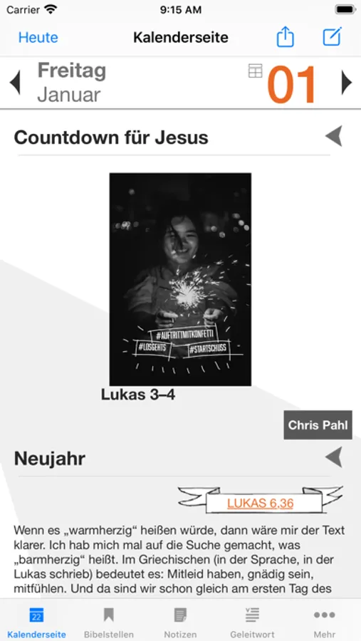 Bibellesen macht Spaß mit der Bibellese-App von „START in den Tag“. Du findest darin für jeden Tag des Jahres einen anregenden Bibelimpuls und verständliche Auslegungen. Durch die Hintergrundinfos kannst du neu in die Welt der Bibel eintauchen und die alten Texte besser verstehen. Und was dir gut gefällt, speicherst du in den Notizen oder teilst es mit Freundinnen und Freunden. Mit dieser App fängt dein Tag gut an!