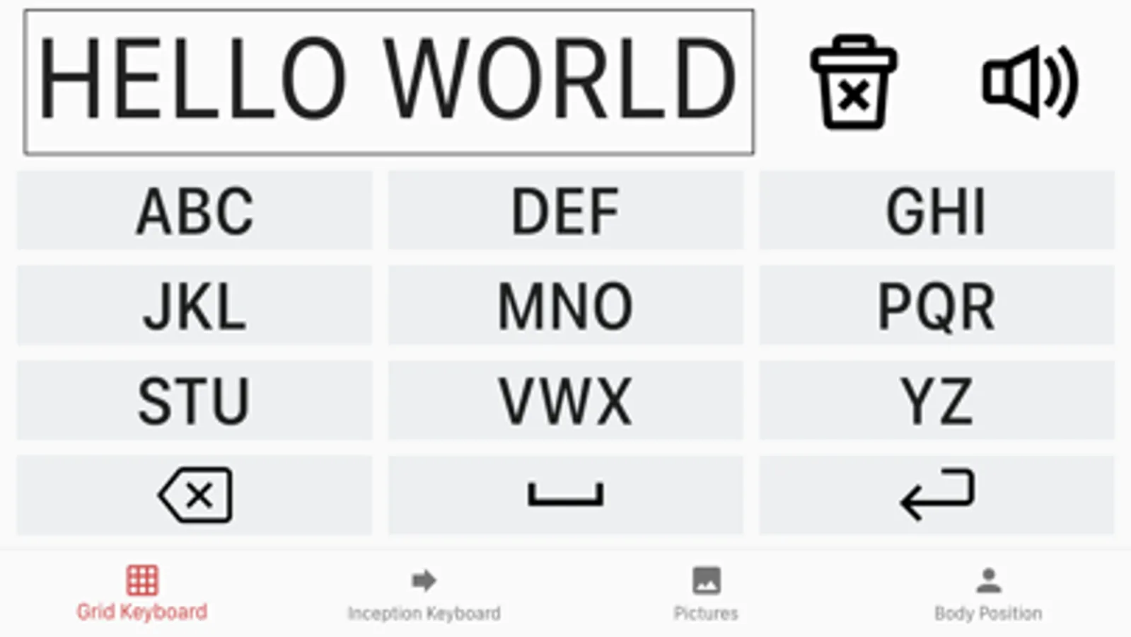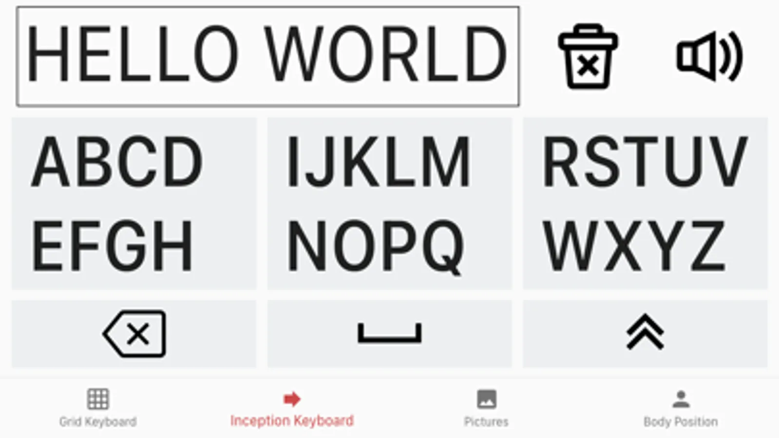 Even bigger buttons than the Grid Keyboard. Every time a key is touched, the number of letter options is reduced until only two or three letters are left. All letters of the alphabet are only three clicks away.