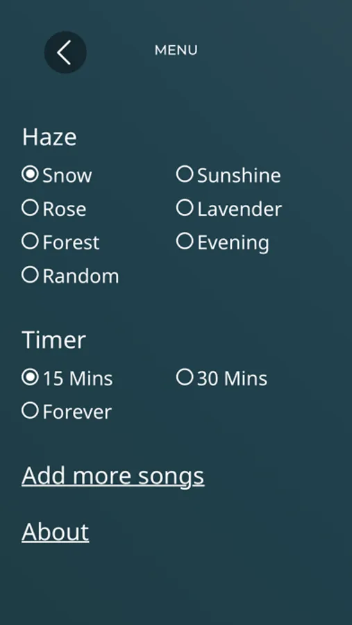 The settings screen allows you to set a timer, select regions you prefer, and even choose the color of the haze through which the background pictures are shown. The haze is a visual filter which softens the visuals and helps to tune out the brain, causing it to pay less attention to minute details, and achieve a more relaxed or meditative state.