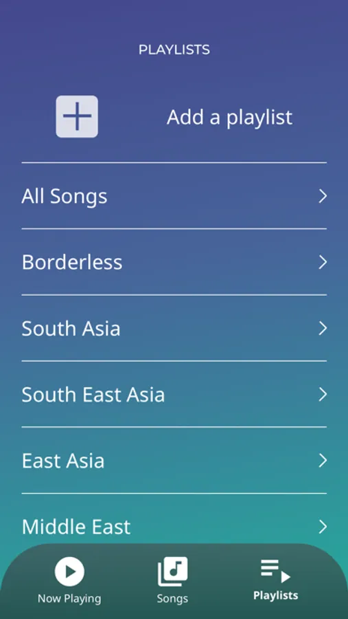 When shipped, the app is configured to play the "all songs" playlist, in order. To play the songs in random order, press the Shuffle button (two arrows crossed). The grouping of songs into regional playlists cannot be changed. However, you may create and edit your own custom playlists, selecting only the songs you would like, and the order in which they are played.