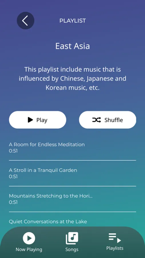 The music in this app is built using the sounds of instruments from various regions around the world. However, it is original music, not the traditional music of the respective world regions.