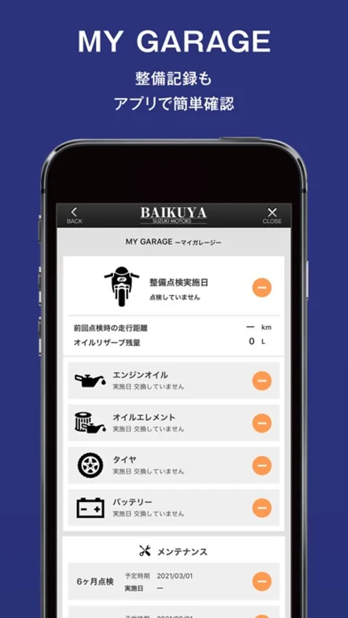 アプリからエンジンオイル・タイヤ・バッテリーの交換時期や車検の時期を確認出来ます。