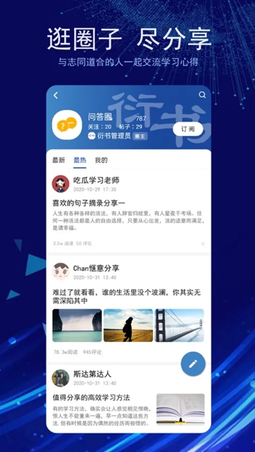 用户可以在这里参与老师组织的训练营、话题圈,巩固和探讨所学的实用知识。问答圈可以向老师定向发出邀约问题,得到专业老师的专属答案,还可以在全网邀约有识之士网罗所有待选解答。