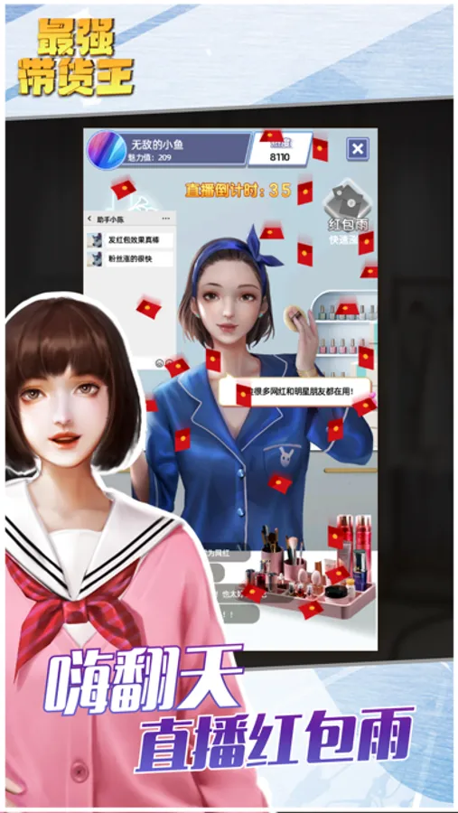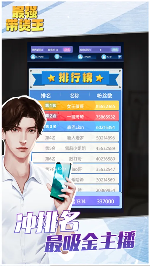 最强带货王是一款真实模拟主播直播带货的休闲游戏,游戏中玩家通过操作不同的主播进行直播带货,体验带货的乐趣。游戏的最大特色是玩家可以操作主播在游戏中与粉丝们进行互动,选择不同的直播行为将会产生不同的结果,影响最终的带货效果,游戏中还会出现各种各样的彩蛋,主播还会出现各种有意思的动作和表情。直播带货是最近比较热门的话题,游戏的设定是希望让每个玩家都可以体验这个经历,享受这个过程。各位家人们还在等什么?赶紧参与进来吧!