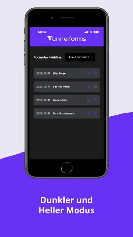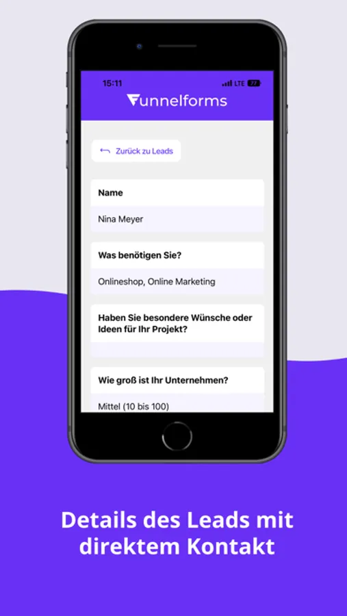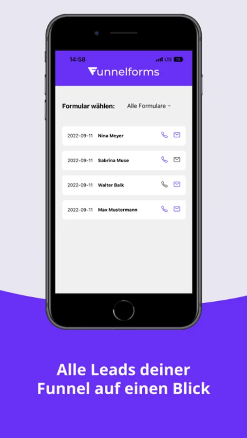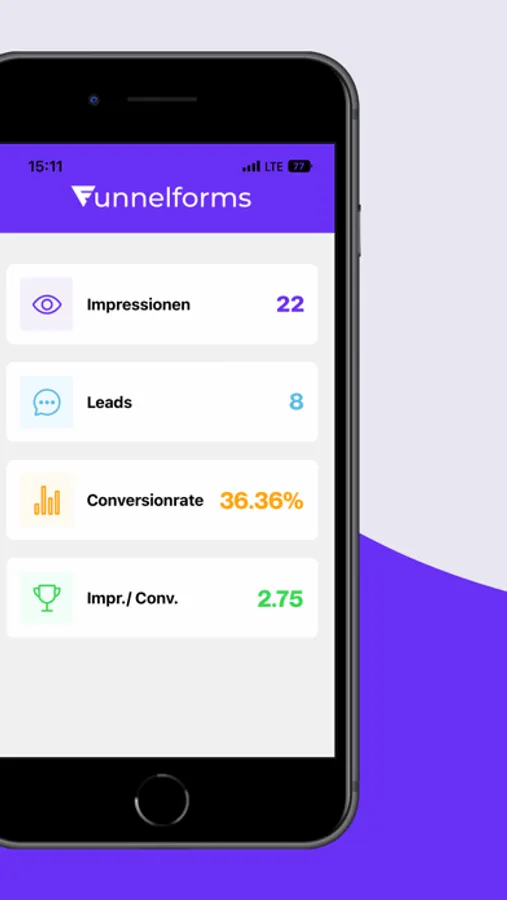 Erhalte mit der offiziellen Funnelforms App eine brandaktuelle Übersicht über deine Leadgenerierung. Sieh dir alle eingegangenen Leads von deinen Formularen an sowie Statistiken mit Zahlen zu Impressionen, Conversions und Conversionrate.