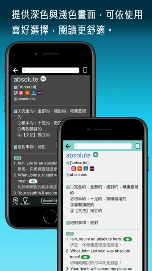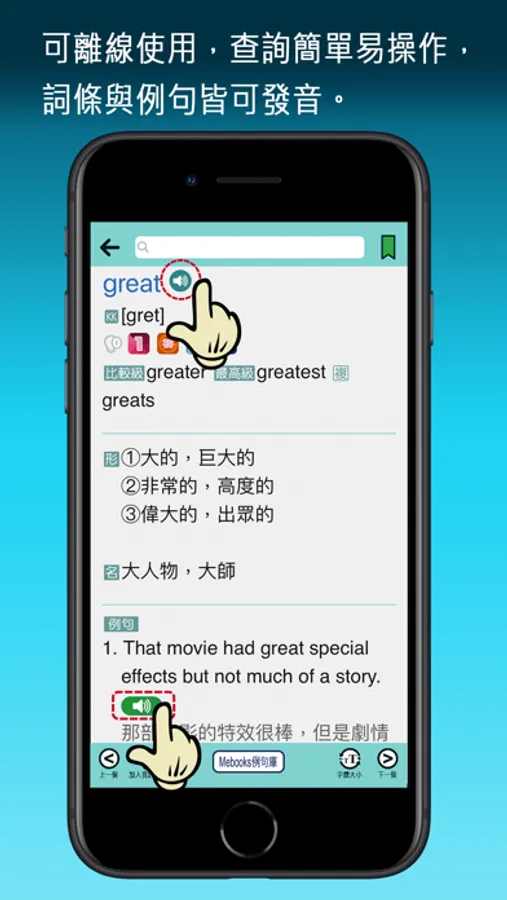《Me實用英漢辭典》提供音標、詞性、字義,並具備發音功能,還提供常用動詞時態變化、名詞複數變化、形容詞/副詞之比較級與最高級變化,讓您不僅可以學習單字的正確用法,還能練習發音。您也能將學過的字彙或是認為艱難的單字添加到書籤裡,以方便日後的復習。