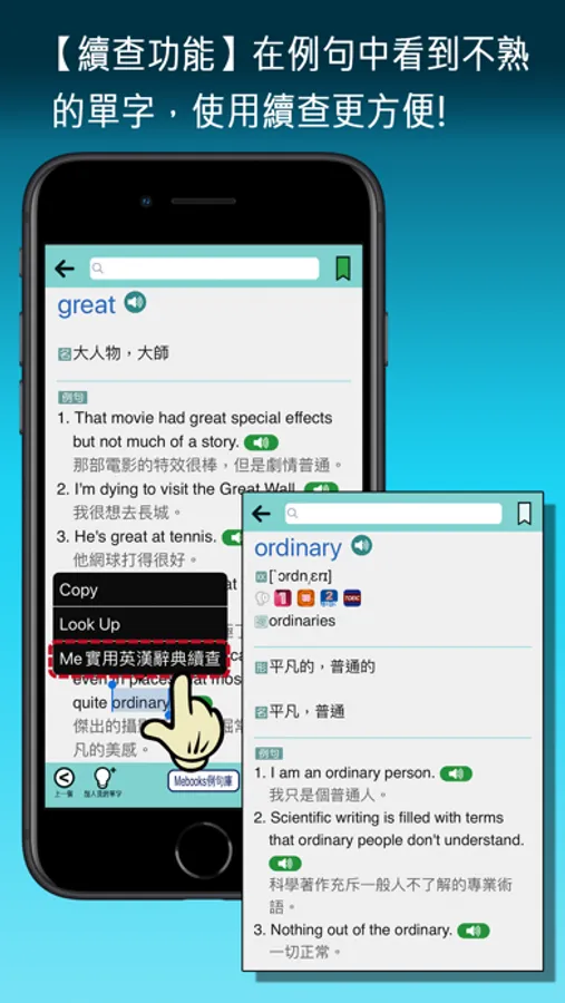 2. 續查功能,在例句中看到不熟的單字,使用續查更方便。除可運用本辭典續查外,也可按照內建的參考選項,選擇其他資訊查看英英單字定義。
