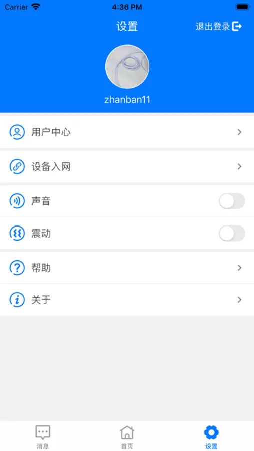 用户中心、修改密码、修改头像、退出登录、设备入网、帮助及关于