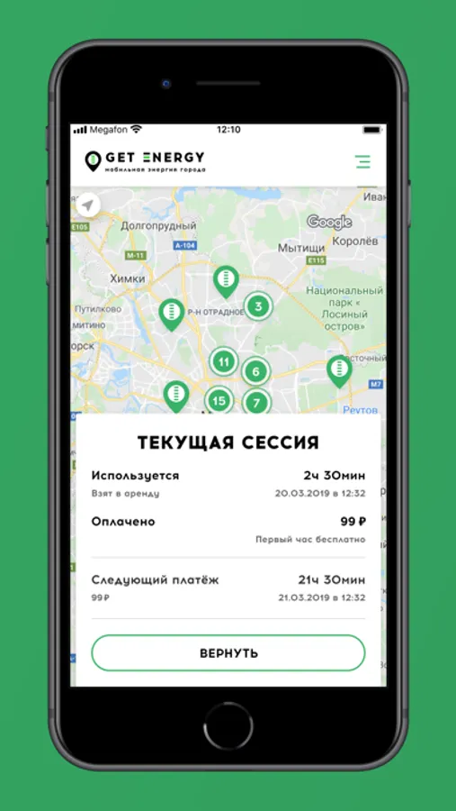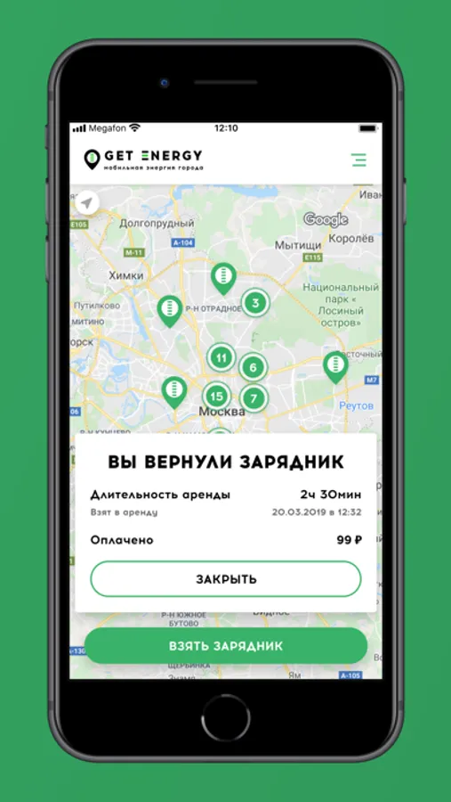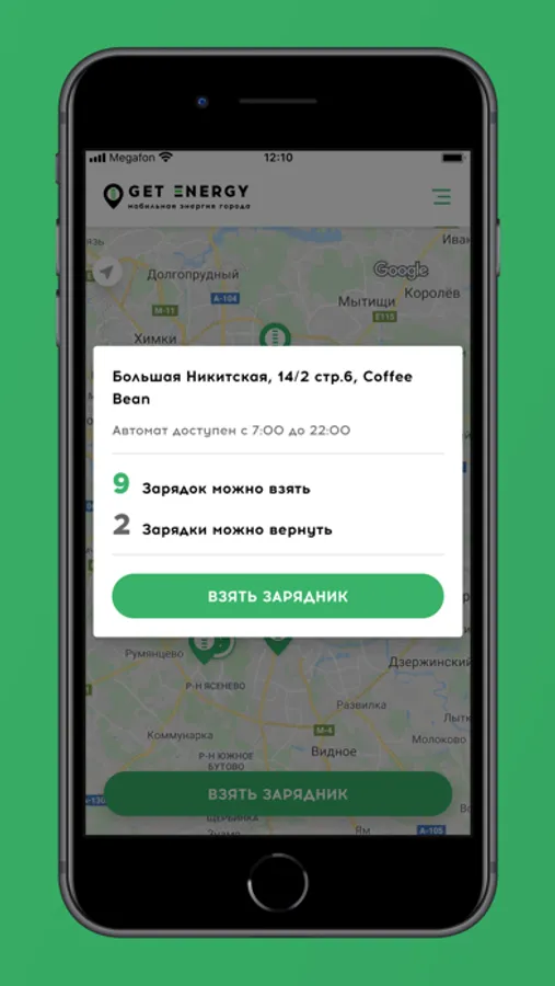 Разрядился телефон в городе ? Возьми Power bank (зарядник) из автомата Get Energy и верни его в любой автомат Get Energy на карте, через час или несколько суток.