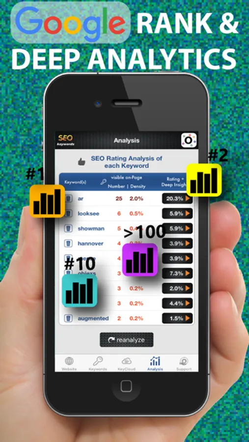 SEO-Keywords includes hints, tips, density ratings, deep insights and "Live" Google Ranks, plus basic HTML structure analysis -all-in-one.