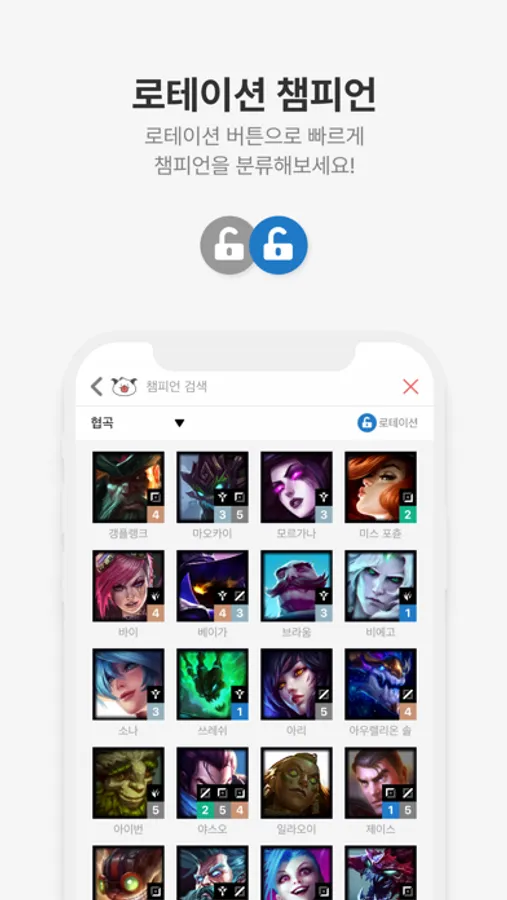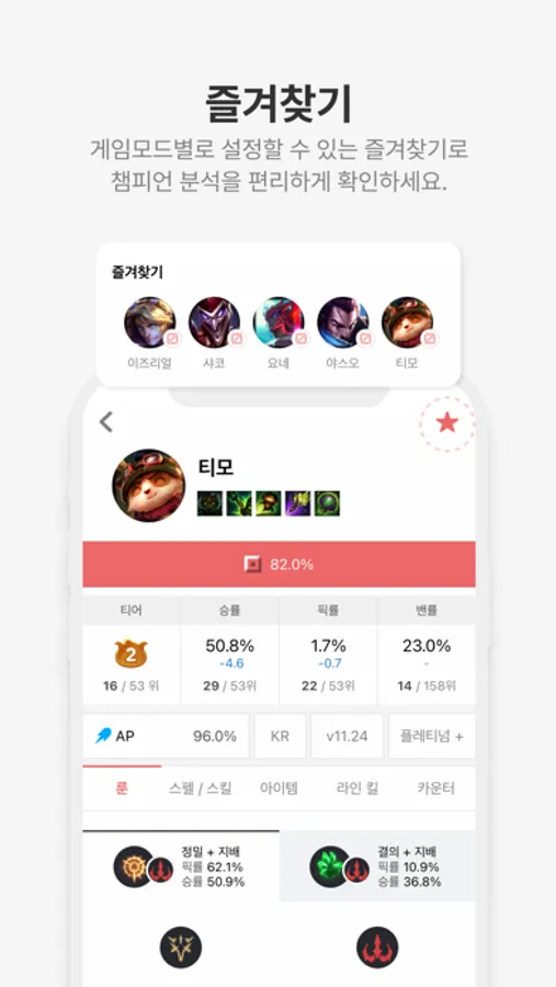 깔끔한 UI와 함께 모든 게임 유형의 챔피언 공략을 모았습니다.