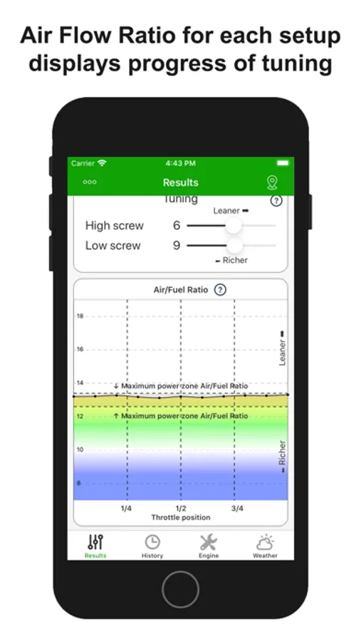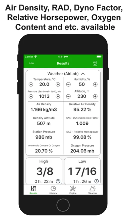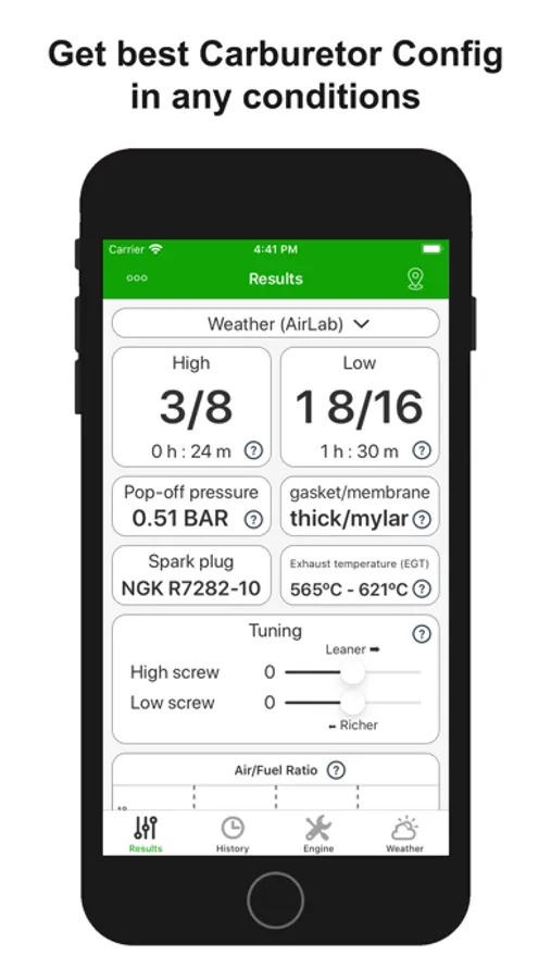 • Results: In this tab high speed screw position, low speed screw position, pop-off pressure, gasket & membrane reccomendation, spark plug, optimal exhaust temperature (EGT) are shown. These data are calculated depending on the weather conditions and the engine configuration given in the next tabs. This tab lets do a fine tuning adjustment for all this values to adapt to the concrete engine. Also the air density, density altitude, relative air density, SAE - dyno correction factor, station pressure, SAE- relative horsepower, volumetric content of oxygen, oxygen pressure are shown too. On this tab, you can also share your settings with your colleagues. You can also see in a graphic form the calculated ratio of air and fuel (lambda).