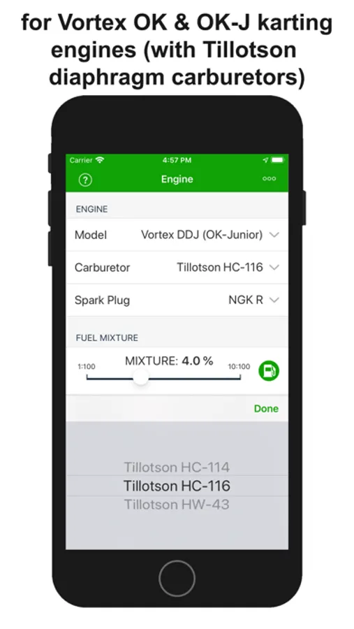 This app provides, using temperature, altitude, humidity, atmospheric pressure and your engine configuration, a recommendation about optimal carburetor config (jetting) for karts with Vortex OK & OK-Junior engines (DJT, DDJ, DST, DDS models) which use a Tillotson diaphragm carburetors