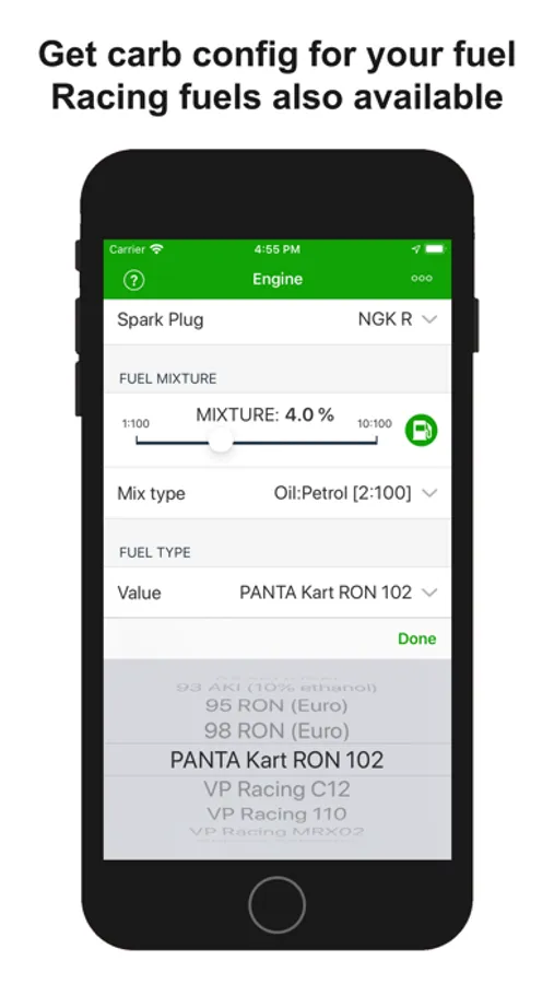 • Selectable fuel type (gasoline with or without ethanol, Racing fuels available, for example: VP Racing, Sunoco, Panta Kart Ron 102)