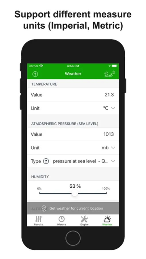 • Weather: In this tab, you can set the values for current temperature, pressure, altitude and humidity. Also this tab allows to use the GPS to get the current position and altitude, and connect to an external service (you can choose one weather data source from several possible) to get the weather conditions of the nearest weather station (temperature, pressure and humidity). In addition, this application can work with a pressure sensor built into the iPhone. You can see if it is available on your device and turn it on or off. Also, on this tab, you can enable alerts about possible carburetor icing.
