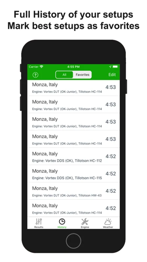 • History: This tab contains the history of all carburetor configs. This tab also contains your favorite carburetor configs.