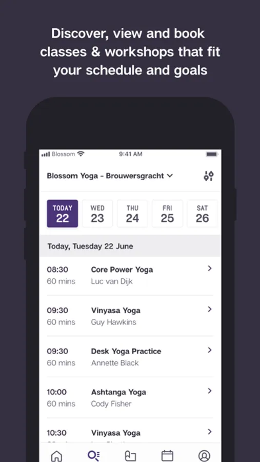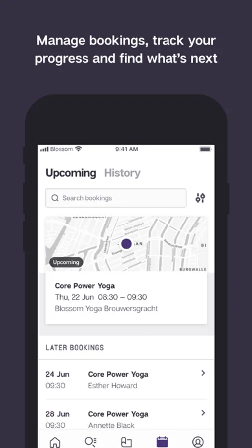 From the Blossom app you can view class schedules, sign up for classes, view your upcoming and past bookings, and edit your profile. Save your time and maximize the convenience of signing up for classes from your own device.