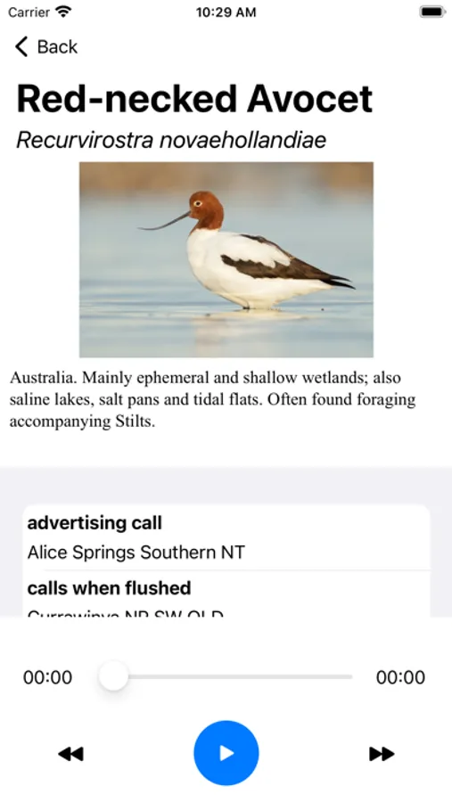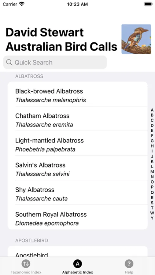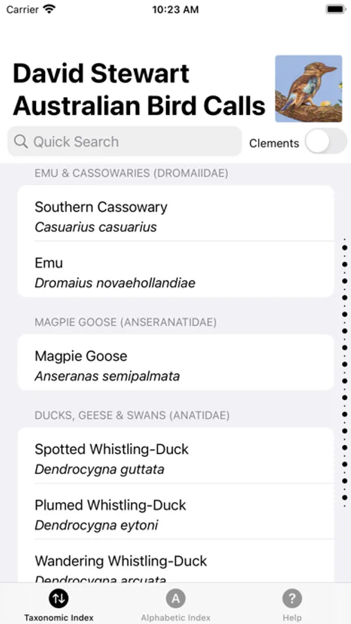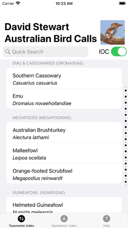 The app contains a taxonomic and alphabetic listing of birds with the ability to switch between IOC 10.1 and Clements World taxonomies with a tap of a button.