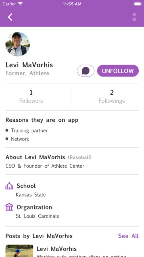 Athlete Center is designed to help current and former collegiate/professional athletes and coaches connect to one another. Once you create your profile and it has been approved, you will be able to see other athletes and coaches in your area. Once you find someone that matches what you are looking for (network, training partner, etc...) you will be able to message them. This app is designed to help athletes and coaches connect to other like-minded people that they otherwise might not be able to connect with. You will be able to use the search feature to view other athletes via the map (where it will show you, other athletes, you are) or via a list. You will be able to filter your searches to match what you are looking for. You will also be able to upload photos and post content to help give other athletes training ideas, and show what you’re about as an athlete!