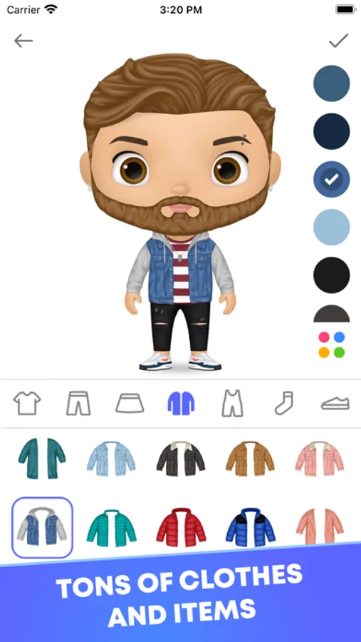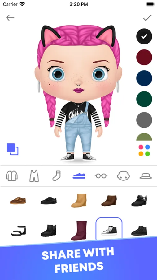 Dress up your character with clothes, shoes and accessories. You can change the color of clothes and accessories as you like to design unique outfits.