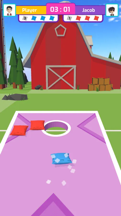 Cornhole is a lawn game in which players take turns throwing 16 ounce bags of corn kernels at a raised platform (board) with a hole in the far end. A bag in the hole scores 3 points, while one on the board scores 1 point. Play continues until a team or player reaches or exceeds the score of 21 by means of cancellation scoring.