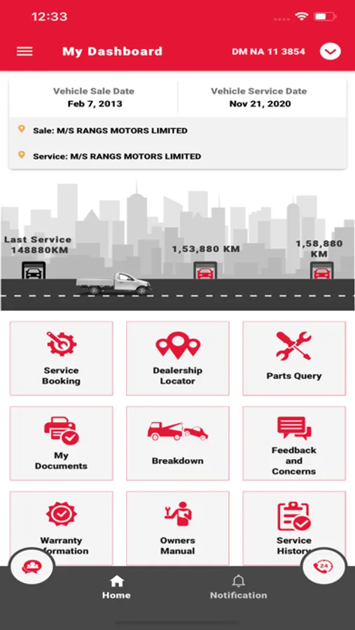 Display of Vehicle Pic with Sales and Service Dealer details, Last km service, and next service Km milestone.