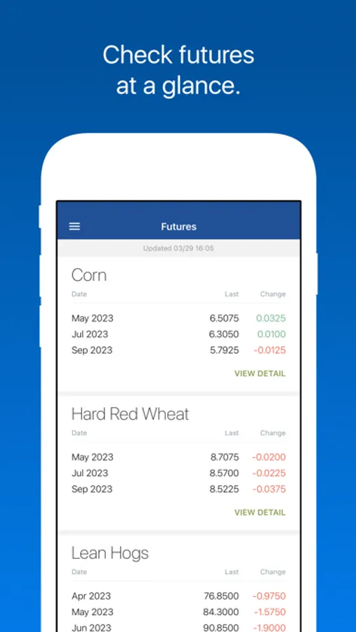 Futures: See Grains, Feed, Livestock, and Ethanol futures listed in order of your preference