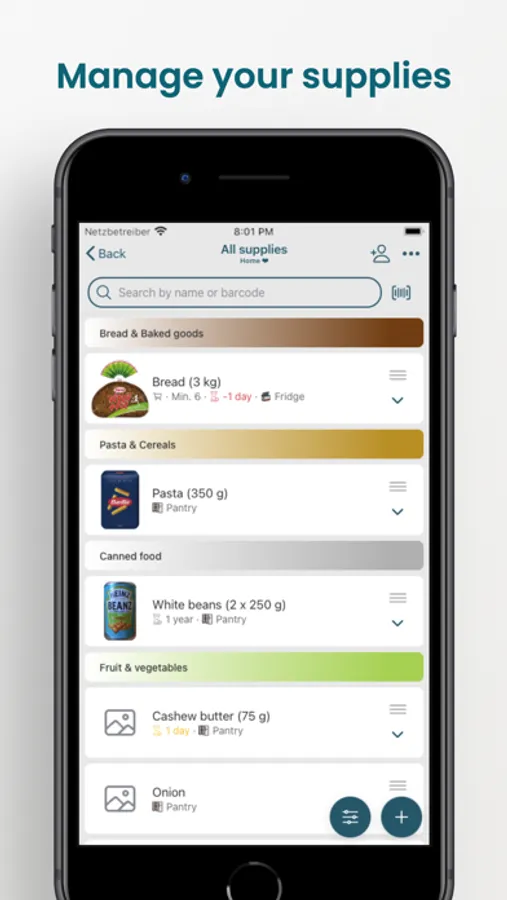 You can add your items via a barcode. Pantrist uses the "Open Food Facts" database to retrieve your barcode data. The database contains over one million items worldwide. If your article is not yet included in the database, you can enter the data for the barcode. Your entries will be saved and the next time a user scans the item, Pantrist will remember it.