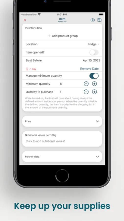 For individual items you can define how many you always want to have in your stock. If you take an item from your pantry and now have fewer items than you set in your minimum stock, the item will be automatically added to your shopping list. This will prevent you from running out of stock. You can also mark articles as open to create the greatest possible transparency about your stocks.