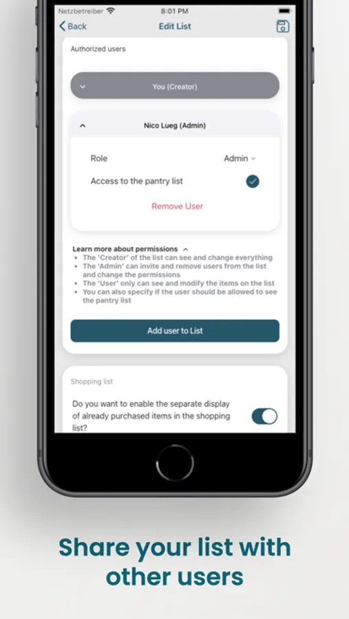 You can easily share your lists via a link. Just send the link of your list via your preferred messenger service or by email. After clicking on the link, any number of people can be added to your list. Then everyone will see the content of the list live. A change appears in a fraction of a second on all devices.