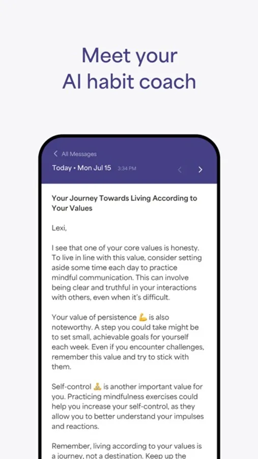 For just 5 minutes “most days,” mark your habits as complete or “not today,” review your values and goals, reflect on your progress and learn from your AI Habit Coach ™