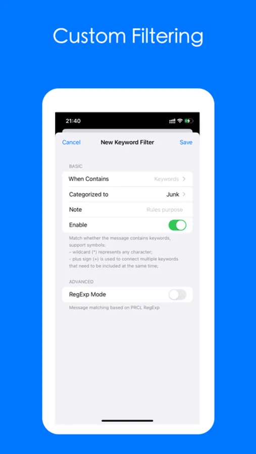 Customize keyword filtering or sender filtering.