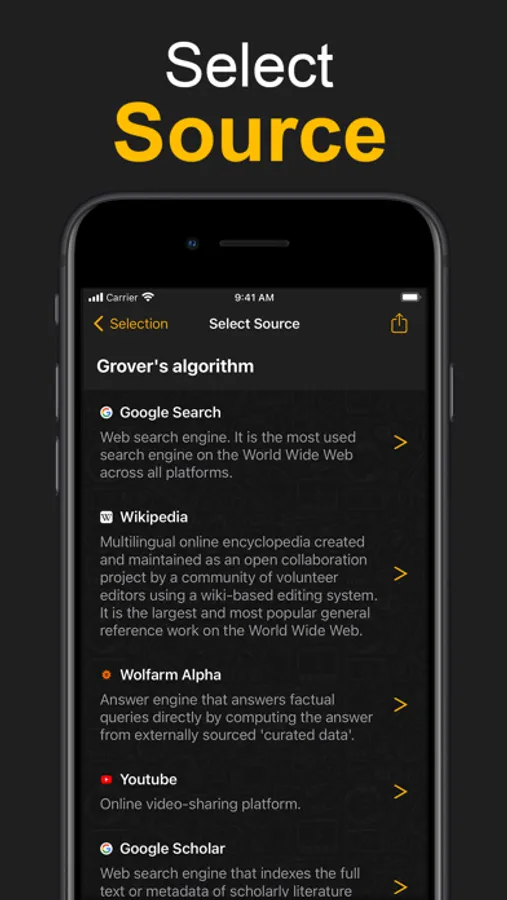Scan documents with ease and browse the results on your favorite sources like Wikipedia, Google Search, Google images, Youtube, Google Scholar, Google Maps, Google Books and Google News.